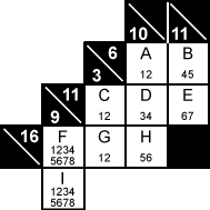 In this example all the candidates are written in each box. One of the permutations for the down run 11 in 2 with boxes B and E is the following: If B = 2 then E = 9 (11-2).